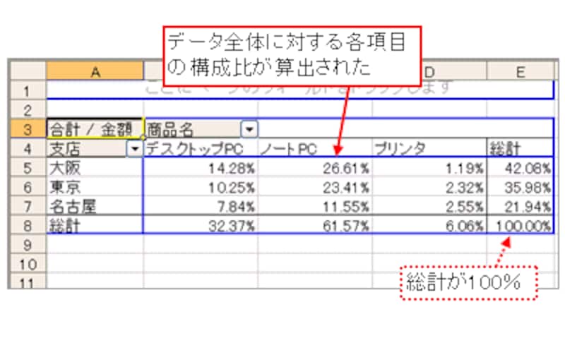 これだけの操作で、データ全体に対する各項目の構成比が算出されました。