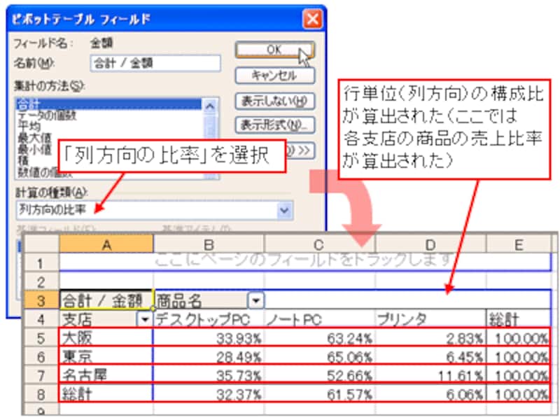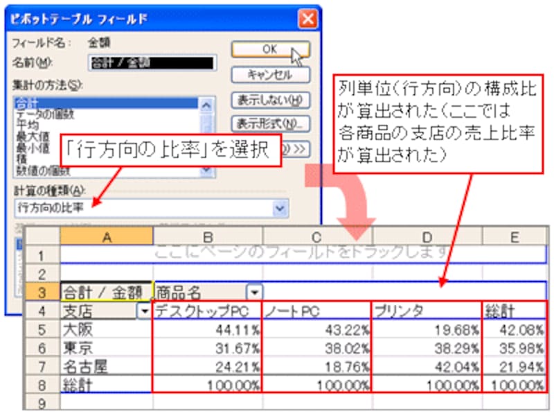 「計算の種類」の一覧から「全体に対する比率」を選択して「OK」ボタンをクリックします。