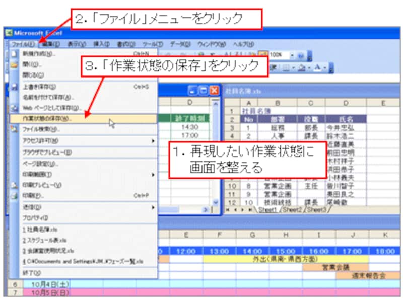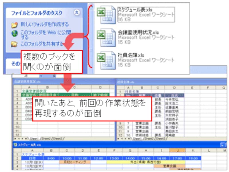 ところで、上記のような作業をするとき、いちいち複数のブックを開いたり、ウィンドウの大きさや整列方法を調整したりと、前回の作業状態を再現するのが面倒ですよね。