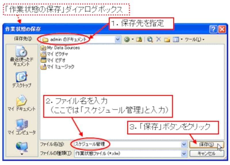 表示された「作業状態の保存」ダイアログボックスで保存先を指定し、作業状態を表す任意のファイル名を入力して「保存」ボタンをクリックします。