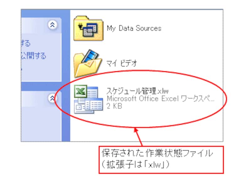 すると、指定した保存先に、拡張子が「xlw」の「作業状態ファイル」が作成されます。このファイルに、作業状態が保存されています。