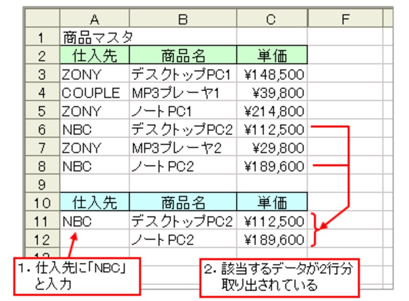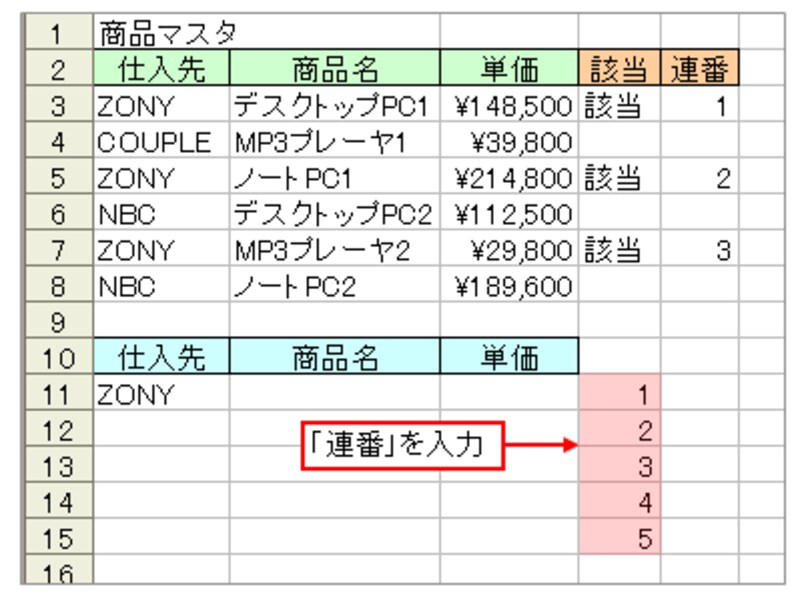 まず、仕入先の条件が入力されているセルと、取り出し元の仕入先のデータを比較して、条件と同じデータが入力されている行に「該当」という文字列を表示するIF関数を作成します。これで、条件を満たしている行を識別できました。![]() |