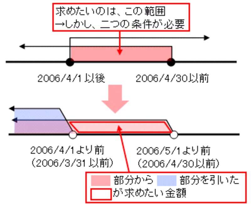 つまり、4月分の合計値は、「2006/5/1より前(2006/4/30以前)」の合計値から「2006/4/1より前(2006/3/31以前)」の合計値を引いた値であることを利用するのです。ひとつの条件で算出したSUMIF関数の結果を組み合わせて、二つの条件で算出したい結果を導き出すというわけです。