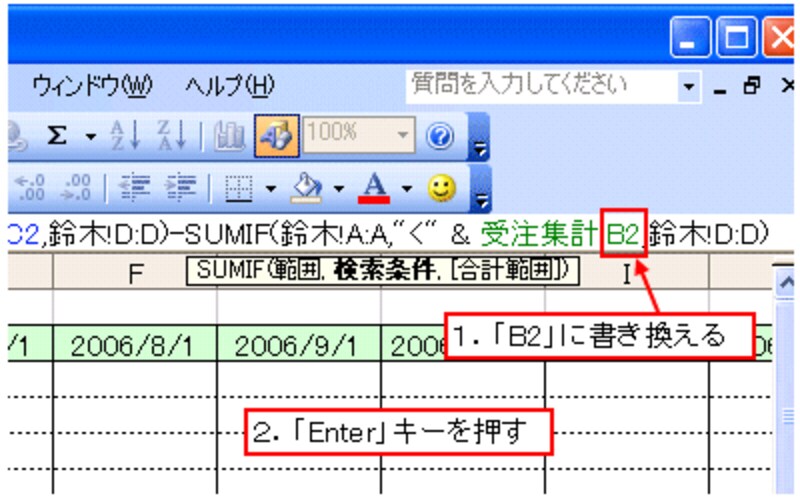 貼り付けた部分の「C2」(「2006/5/1」と入力されているセル番地)を「B2」(「2006/4/1」と入力されているセル番地)に書き換えて、「Enter」キーを押します。