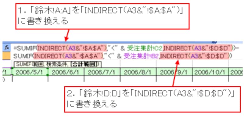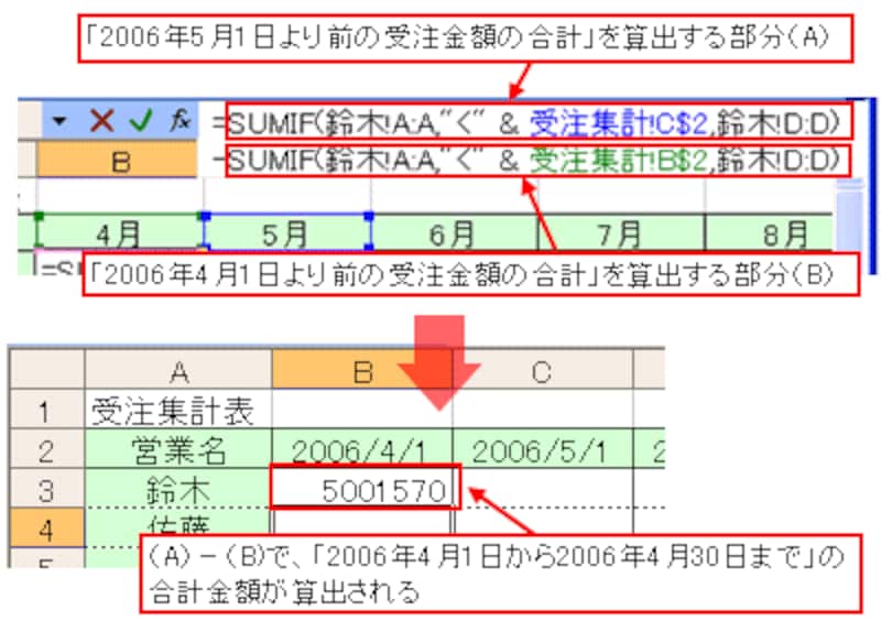 これで、貼り付けた部分が「2006年4月1日より前の受注金額の合計」を算出する部分となり、「2006年5月1日より前の受注金額の合計」から「2006年4月1日より前の受注金額の合計」を引いた値、つまり「2006年4月1日から2006年4月30日まで」の合計金額が算出されました。