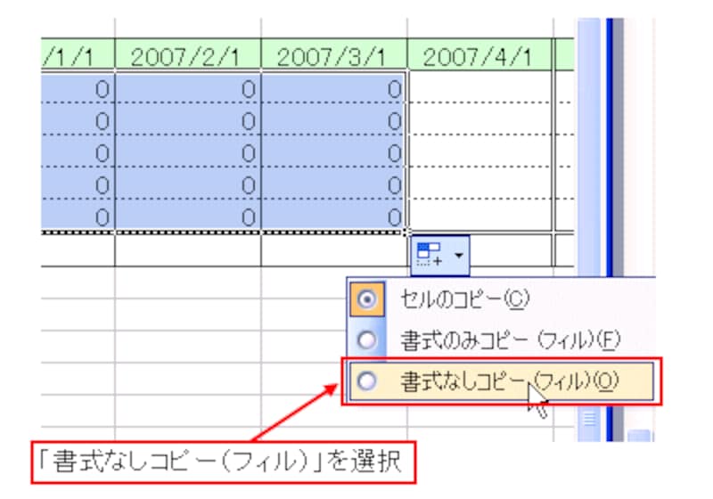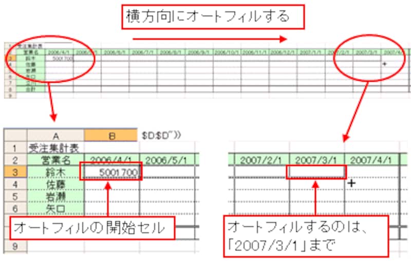 この計算式を、合計を表示したいセルにオートフィルを使用してコピーします。まず、横方向にオートフィルします。その際、ダミーとして入力した「2007/4/1」のセルまでオートフィルしないように気を付けてください。
