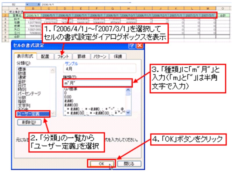 日付の表示書式を「○月」となるように設定します。この設定は、「セルの書式設定」ダイアログボックスの「表示形式」タブで、次のように設定します。
