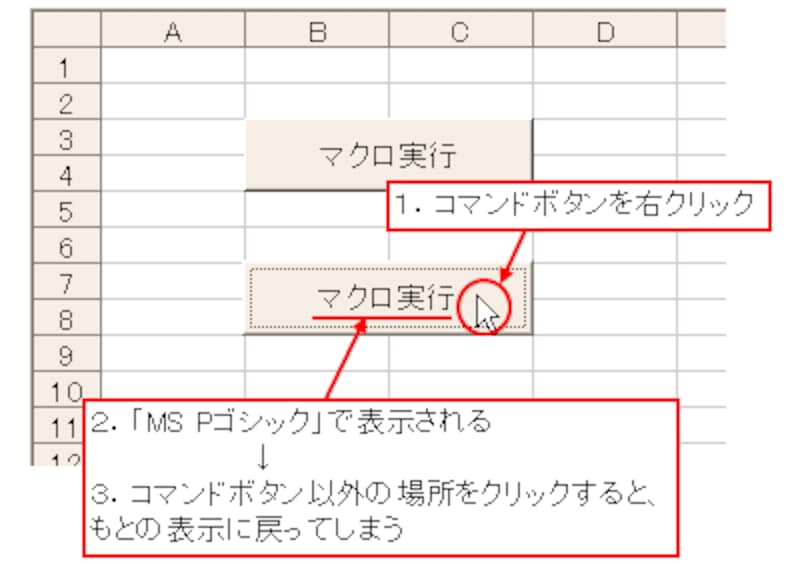 なお、コマンドボタンを右クリックすると、一時的に「MS Pゴシック」で表示されますが、コマンドボタン以外の場所をクリックすると、もとの表示に戻ってしまいます。
