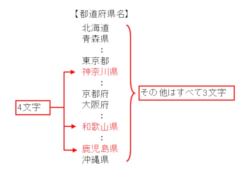 取り出そうとしている都道府県名は全部で47つ。そのすべての都道府県名を見てみると、「神奈川県」「和歌山県」「鹿児島県」だけが4文字で、その他は、すべて3文字であることがわかります。