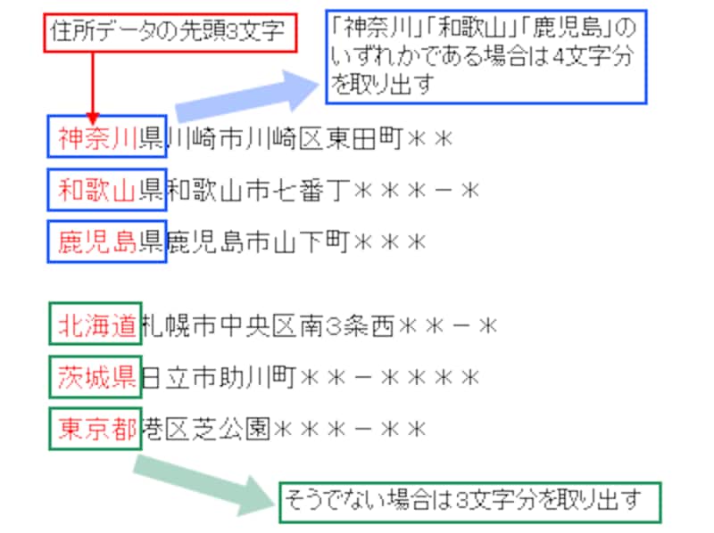したがって、住所データの先頭3文字が「神奈川」「和歌山」「鹿児島」のいずれかである場合は、住所データの先頭4文字分、それ以外の場合は、都道府県に限らず住所データの先頭3文字分を取り出せば、どの都道府県名でも間違いなく取り出すことができます。