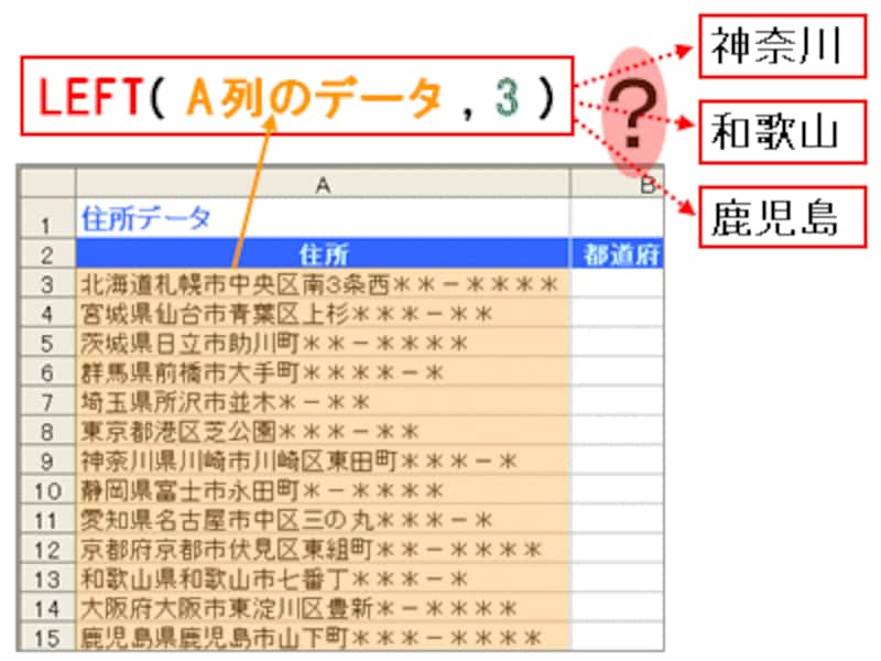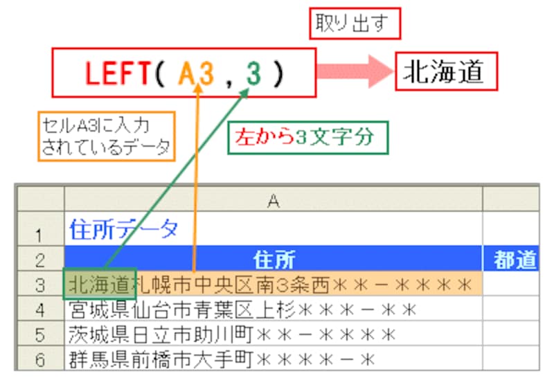 住所データの先頭3文字を調べるには、LEFT関数を使って、住所データの先頭から3文字分の文字列を取り出します。