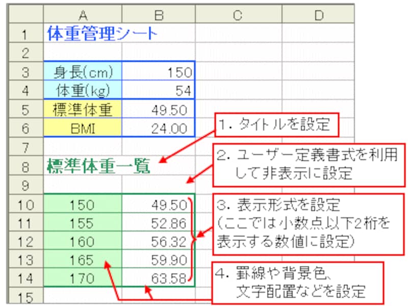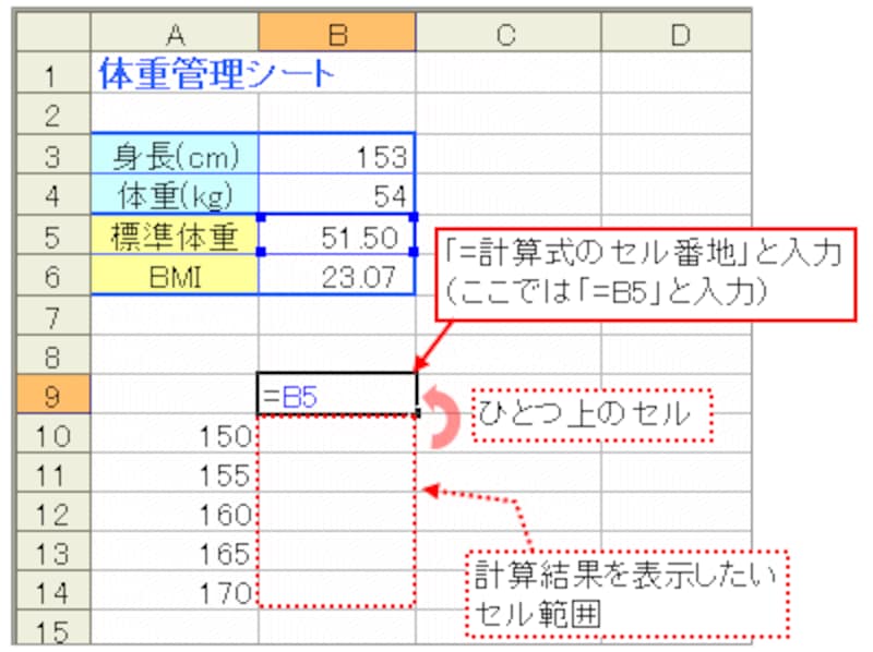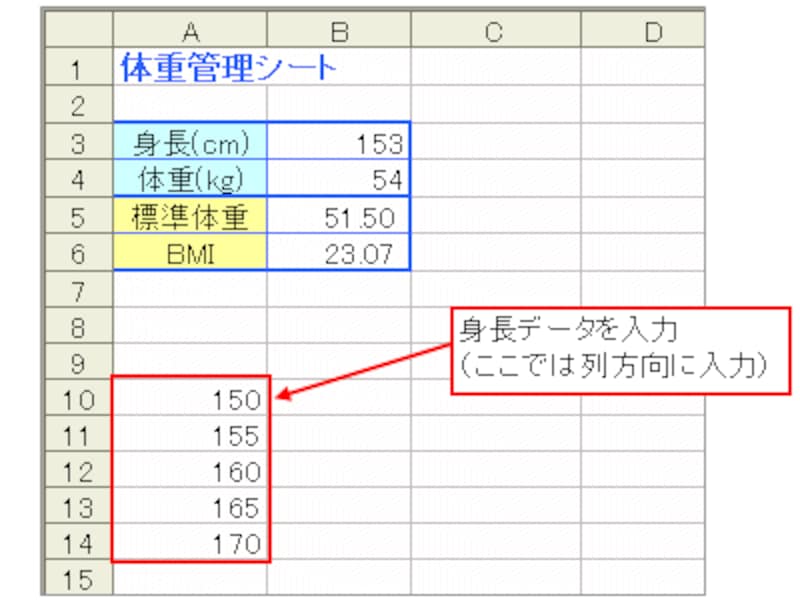 現在、「標準体重」を計算する数式はセルB5に入力されています。そして、標準体重の計算は、セルB3に入力されている「身長」データを使用しています。したがって、ここでは、様々な身長データによる標準体重の計算結果を作成します。