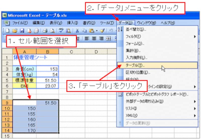 「身長データ」と「計算結果を表示したいセル範囲」、「計算式を参照させたセル」を含めたセル範囲を選択して、「データ」メニュー→「テーブル」をクリックします。