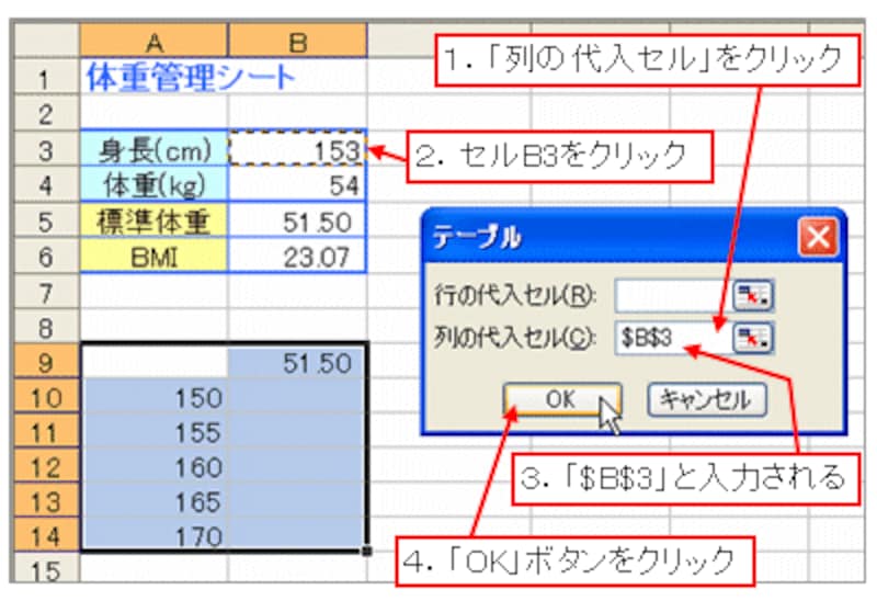 表示された「テーブル」ダイアログボックスで「列の代入セル」をクリックし、計算式が参照しているセルB3(身長が入力されているセル)をクリックして「OK」ボタンをクリックします。