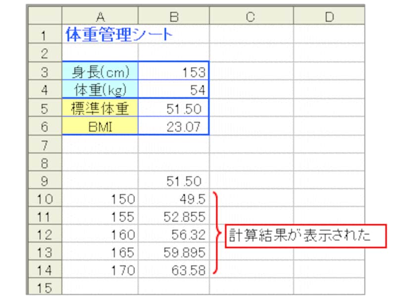 計算結果が表示されました。様々な身長データによる標準体重の計算結果が「一度に」「一覧形式で」作成されましたね。