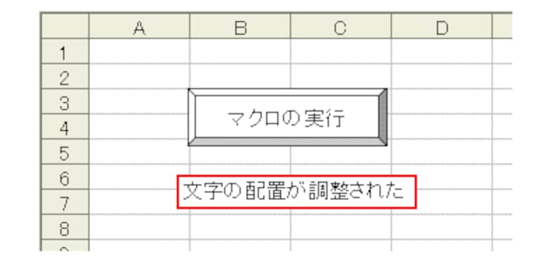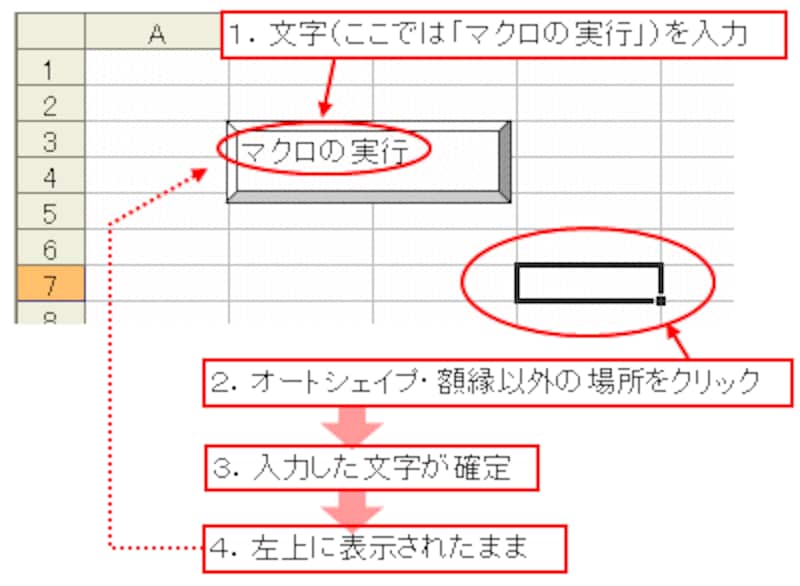 カーソルが表示されるので、ここへ文字(ここでは「マクロの実行」)を入力します。入力後、オートシェイプ・額縁以外の場所をクリックすると、入力した文字が確定しますが、左上に表示されたままです。