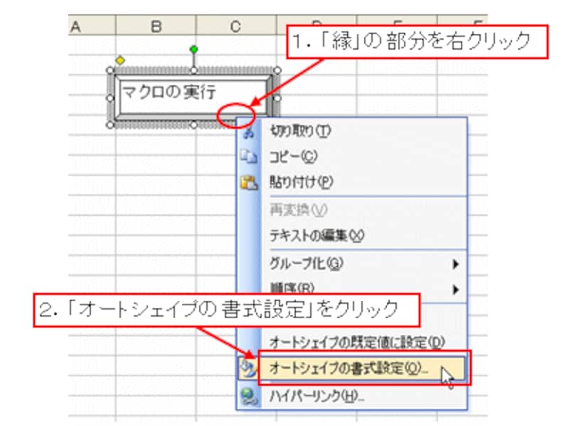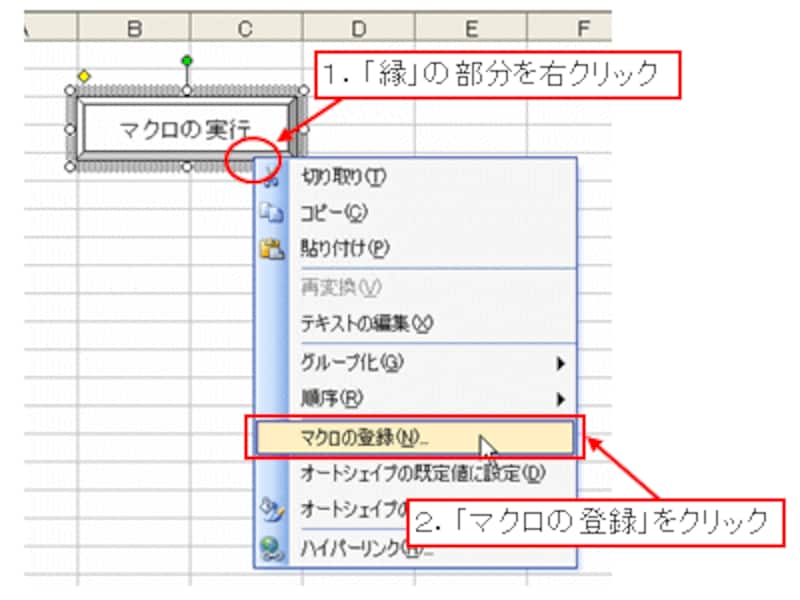 作成したオートシェイプ・額縁の「縁」の部分を右クリックして、表示されたショートカットメニューから「マクロの登録」をクリックします。|  |