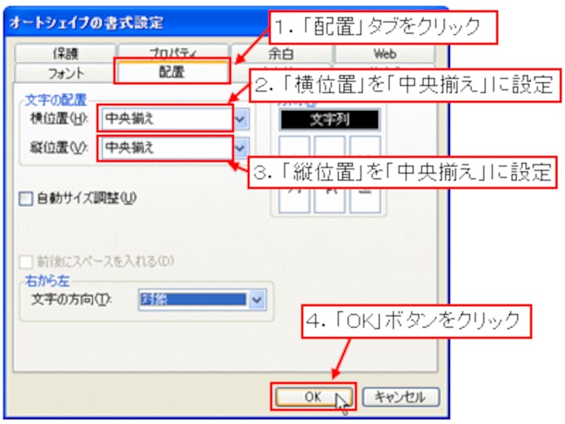 表示された「オートシェイプの書式設定」ダイアログボックスの「配置」タブをクリックして、「文字の配置」の「横位置」と「縦位置」を共に「中央揃え」に設定し、「OK」ボタンをクリックします。