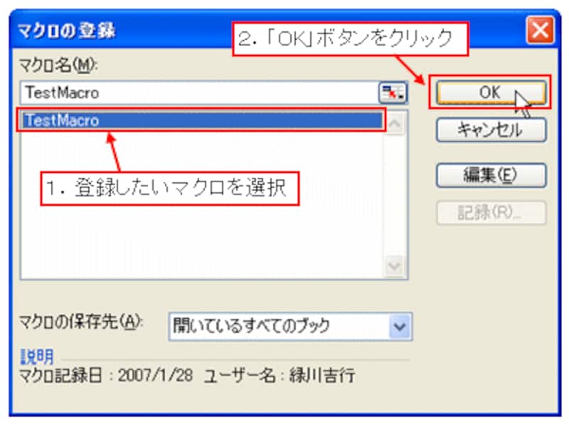 表示された「マクロの登録」ダイアログボックス内の一覧から、登録したいマクロを選択して、「OK」ボタンをクリックします。