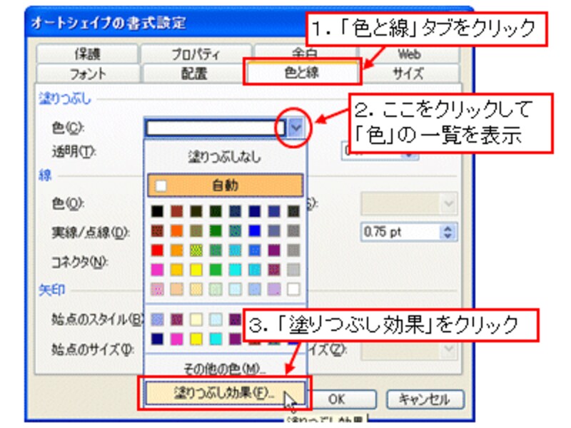 「色と線」タブをクリックし、「塗りつぶし」の「色」の一覧を表示して、「塗りつぶし効果」をクリックします。