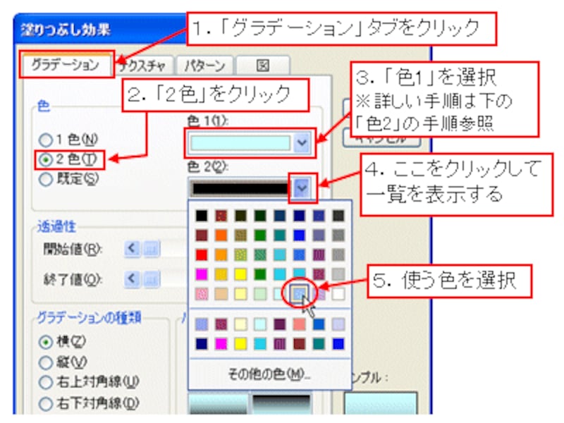 表示された「塗りつぶし効果」ダイアログボックスの「グラデーション」タブをクリックして、ここでは「色」の「2色」をクリックします。右側に表示された「色1」「色2」で、グラデーションで使う色を選択します。