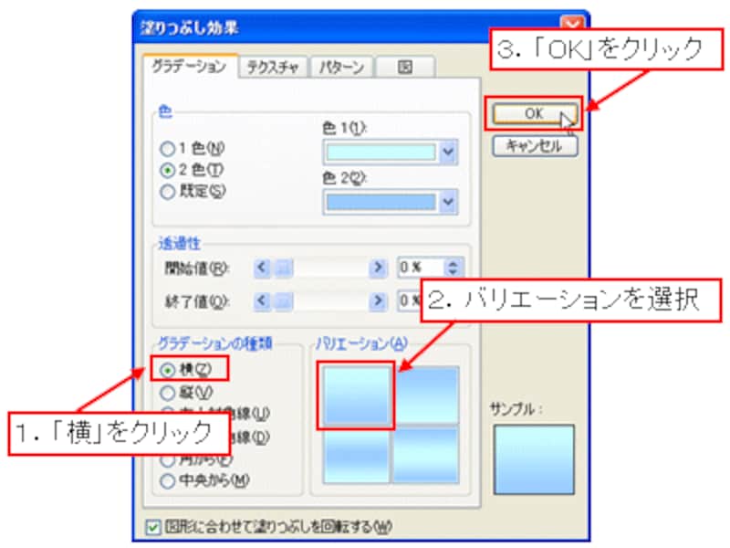 「グラデーションの種類」で「横」をクリックし、その右側に表示された「バリエーション」からお好みのバリエーションを選択して「OK」をクリックします。