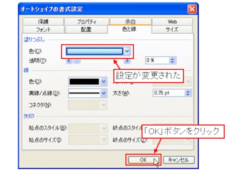 「オートシェイプの書式設定」ダイアログボックスの「OK」ボタンをクリックします。