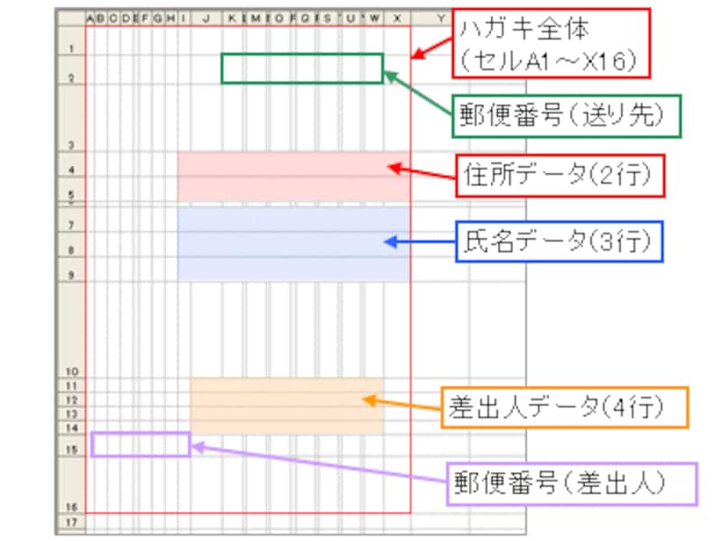 すると、次のようなワークシートが作成できます。ここでは、住所データを2行、氏名データを3行に分けて表示できるように設計しました。また、郵便番号欄は、枠と枠の間も1列として設計しています。