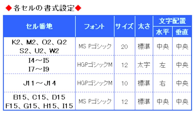 続いて、セルの書式を設定します。ここでは、フォントと文字配置の設定例を紹介します。これらの設定を目安にして、好みに合わせて設定してみてください。