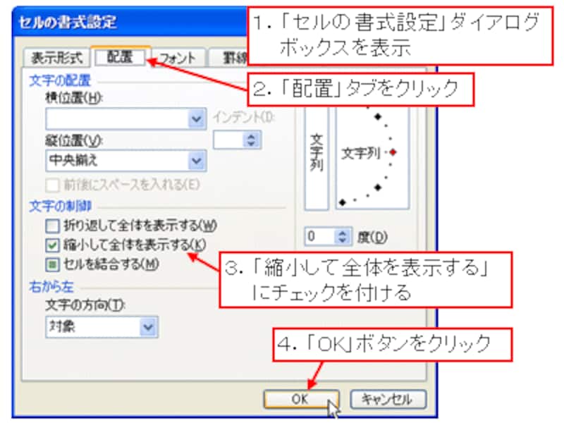 なお、データが長すぎてはみ出てしまわないように、住所データと氏名データを表示するセルは「縮小して全体を表示する」ように設定しておきましょう。「セルの書式設定」ダイアログボックスを表示して、「配置」タブの「文字の制御」にある「縮小して全体を表示する」にチェックを付けてください。