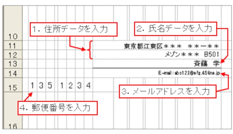 セルの書式が設定できたら、差出人のデータと郵便番号を入力しておきます。差出人のデータについては、4行分の入力欄を用意しています。次の入力例では、上2行に住所データ、3行目に氏名データ、4行目にメールアドレスを入力しています。また、氏名データとメールアドレスの間に罫線を引いてみました。