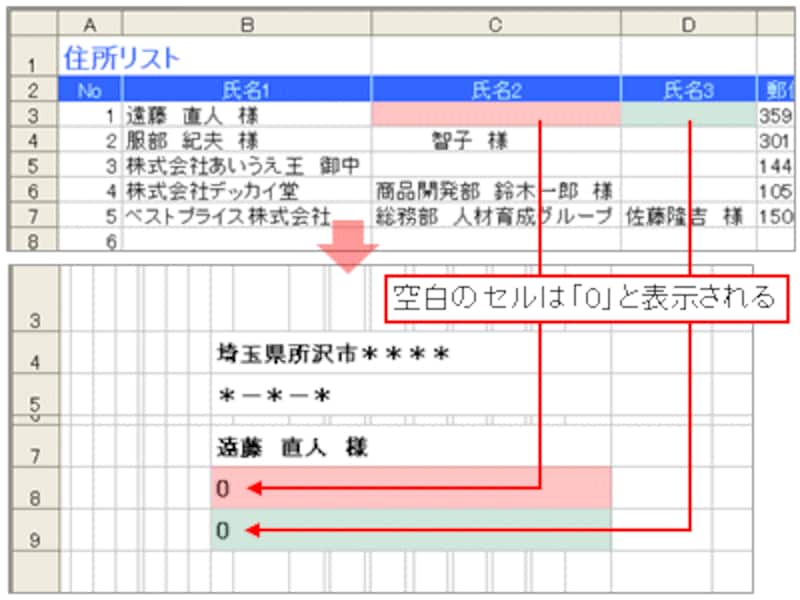 また、住所2や氏名2~氏名3のデータは空白の場合がありますね。この場合、VLOOKUP関数は「0」を返します(Noは検索できているので、エラーは発生しません)。