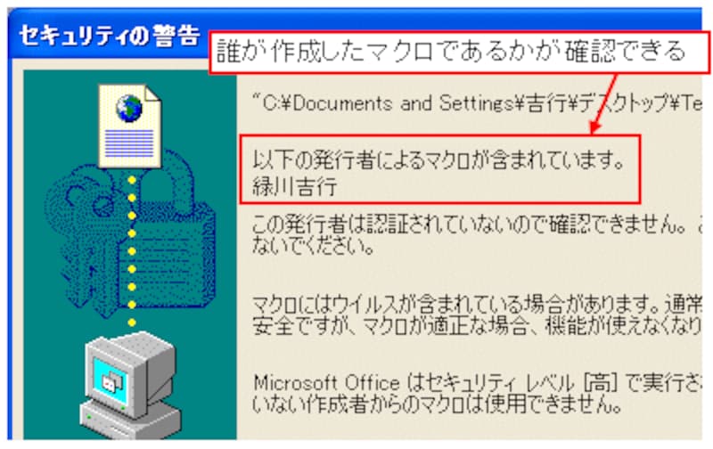 マクロに署名があれば、「誰が作成したマクロであるか」を確認してからマクロを有効にできます。