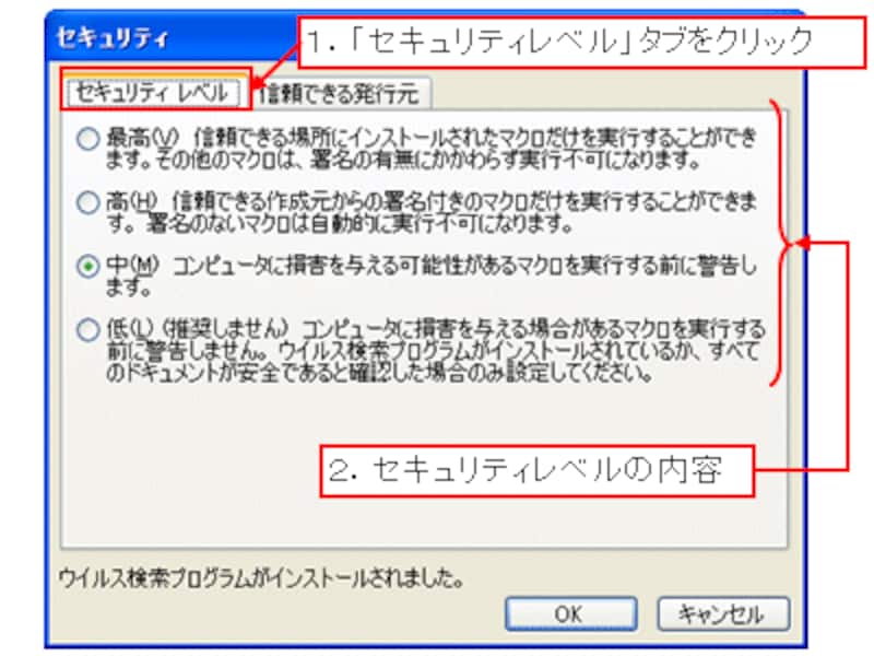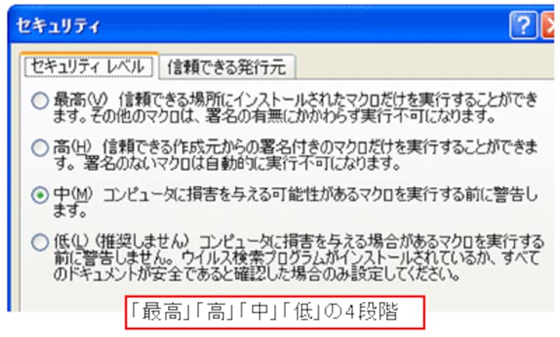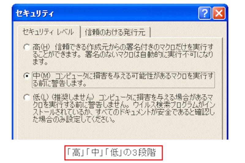 Excel2000・2002の場合は「高」「中」「低」の3段階、Excel2003の場合は、これに「最高」が加わった4段階のセキュリティレベルがあり、現在設定されているセキュリティレベルのオプションボタンが選択されています。