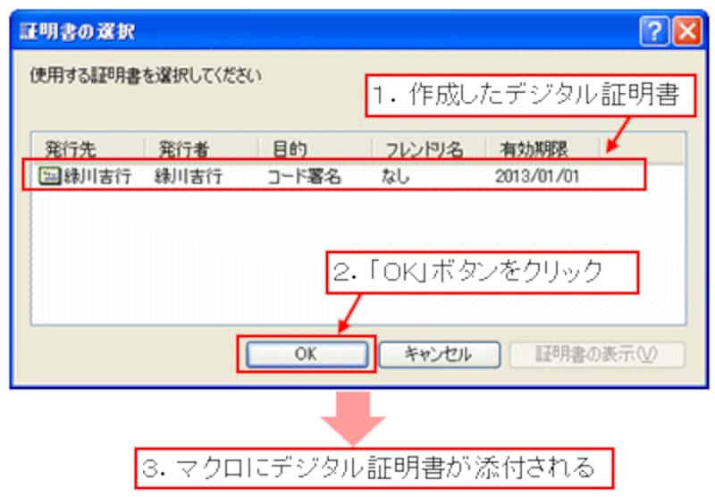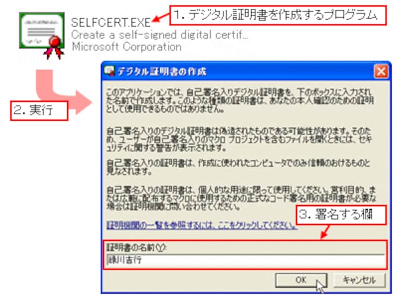 セキュリティレベルの話を始める前に、マクロの署名について理解しておく必要があります。セキュリティレベルの話の中で「マクロに署名があるか、ないか」といった話が出てきますが、この「署名」とはマイクロソフトの「デジタル証明書」への署名のことで、「マクロに署名がある」とは、「署名のあるデジタル証明書がマクロに添付されている」ことを表します。