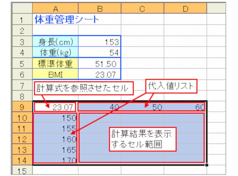 複入力テーブルでは、計算式を参照させるセルが単入力テーブルとちょっと違います。複入力テーブルでは「タテ方向の代入値リストが入力されている列と、ヨコ方向の代入値リストが入力されている行が交わっているセル」から計算式のセルを参照させます。ここでは、身長の代入値リストが入力されているA列と体重の代入値リストが入力されている9行目が交わっているセルA9から、計算式のセルを参照させます。