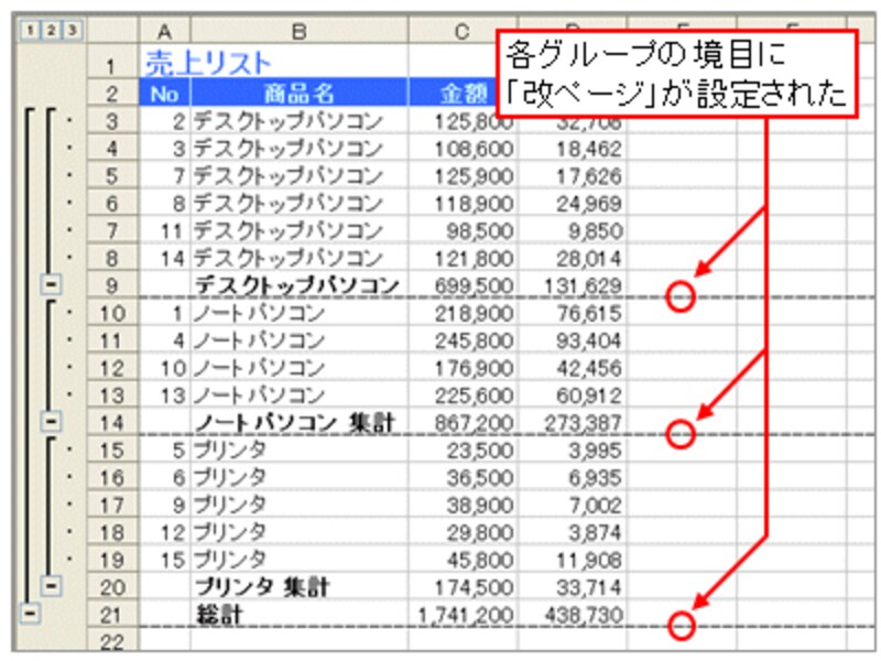 この設定で集計を実行すると、集計結果の各グループの境目に「改ページ」が設定されます。