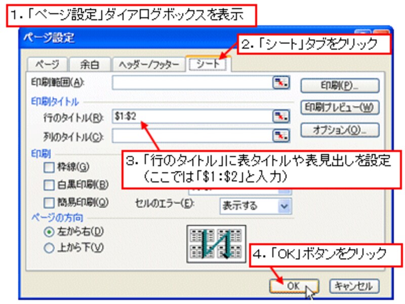 さらに、「ファイル」メニュー→「ページ設定」をクリックして、表示された「ページ設定」ダイアログボックスの「シート」タブ内の「行のタイトル」で表タイトルや表見出しを行のタイトルとして設定しておくと良いでしょう。