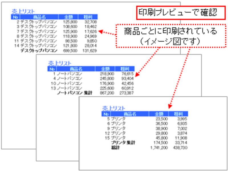 集計機能では、集計したグループごとに印刷することができます。各グループの明細が多い集計結果を印刷する場合などに便利な機能です。