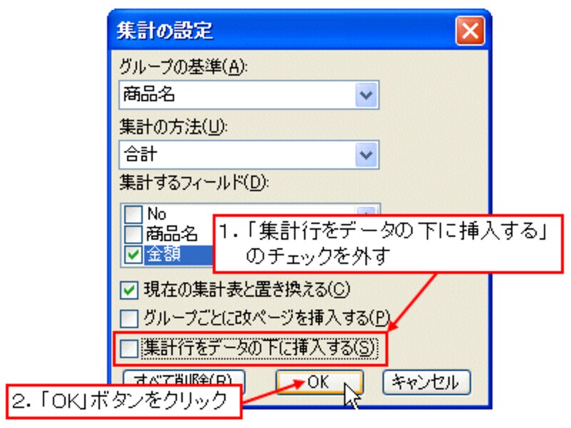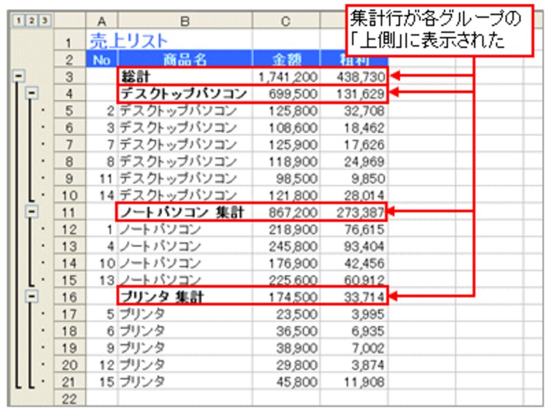 その原因は、集計を実行するときに「集計の設定」ダイアログボックスの「集計行をデータの下に挿入する」のチェックを外さなかったためです。このチェックを外して集計を実行すると、集計行が各グループの「上側」に表示されるようになります。