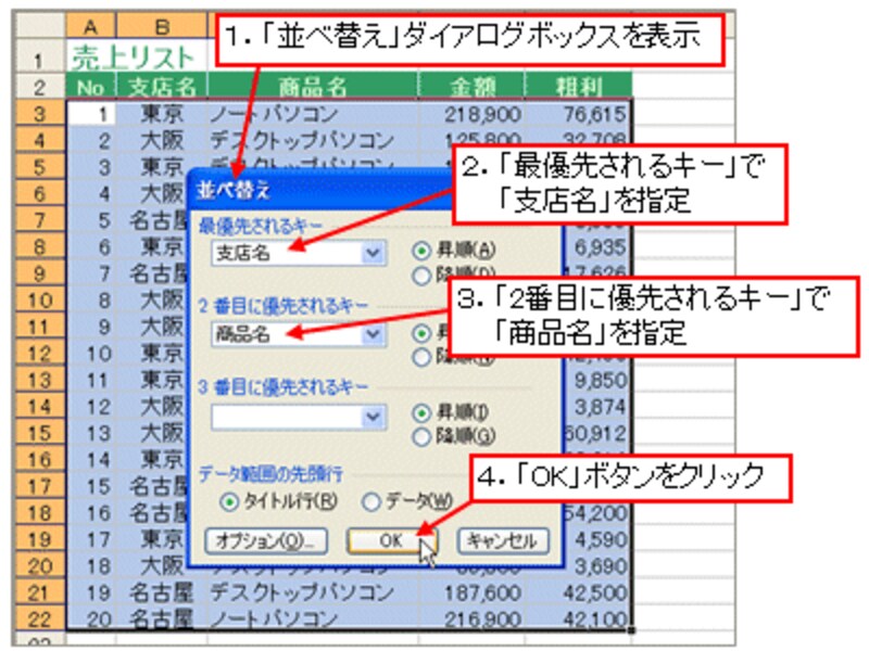 準備として、「支店名」で並べ替えてから「商品名」で並べ替えておきます。