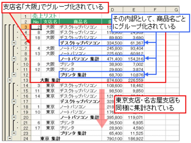 「ある項目について集計し、さらに別の項目による内訳も表示したい」といったように、複数の項目を基準にグループ化して集計したい場合があると思います。ここでは、下図のようなリストで、まず「支店名ごと」にグループ化し、さらに、その内訳として「商品名ごと」にグループ化して、「金額」と「粗利」の「合計」を算出してみます。