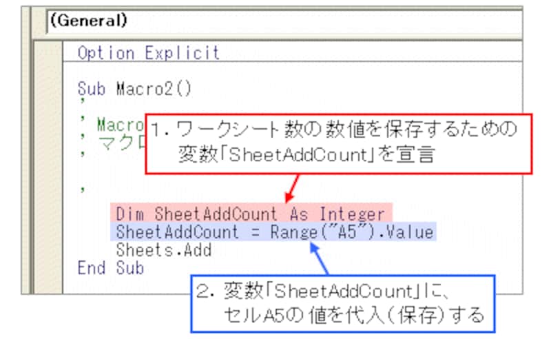 VBEの画面に戻り、入力されたワークシート数の数値を保存するための変数を宣言します。ここでは、整数を保存するInteger型の変数「SheetAddCount」を宣言します。そして、この変数に、セルA5の値を代入(保存)するステートメントを記述します。