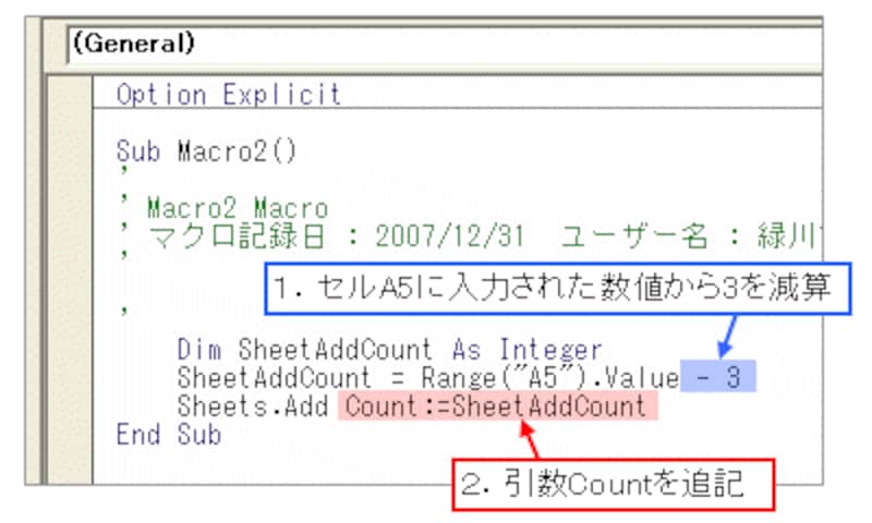 ここで、ひとつ注意点があります。ブックを作成すると、既に3つのワークシートが含まれていますね。したがって、セルA5に入力された数値から3を減算した数値が、実際に追加するワークシートの数になります。そして、その数値を引数Countに設定する内容を追記します。