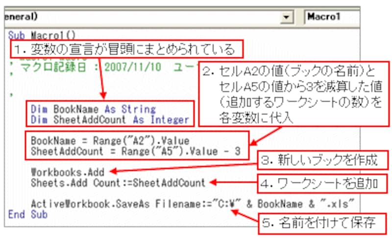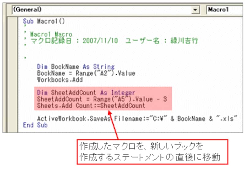 そして、変数を宣言するステートメントを冒頭にまとめます。また、ワークシート数を変数「SheetAddCount」に代入するステートメントは、新しいブックを作成するステートメントの前に移動します。新しいブックが作成された後だと、「Range("A5").Value」は、新しいブック上のセルA5の値を参照してしまうからです。