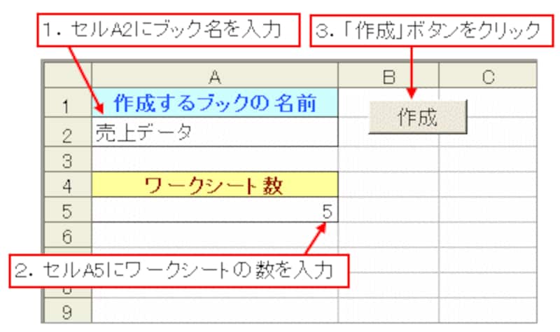 早速、実行してみましょう。セルA2にブック名を入力し(ここでは「売上データ」と入力)、セルA5にワークシートの数を入力して(ここでは「5」と入力)、「作成」ボタンをクリックします。