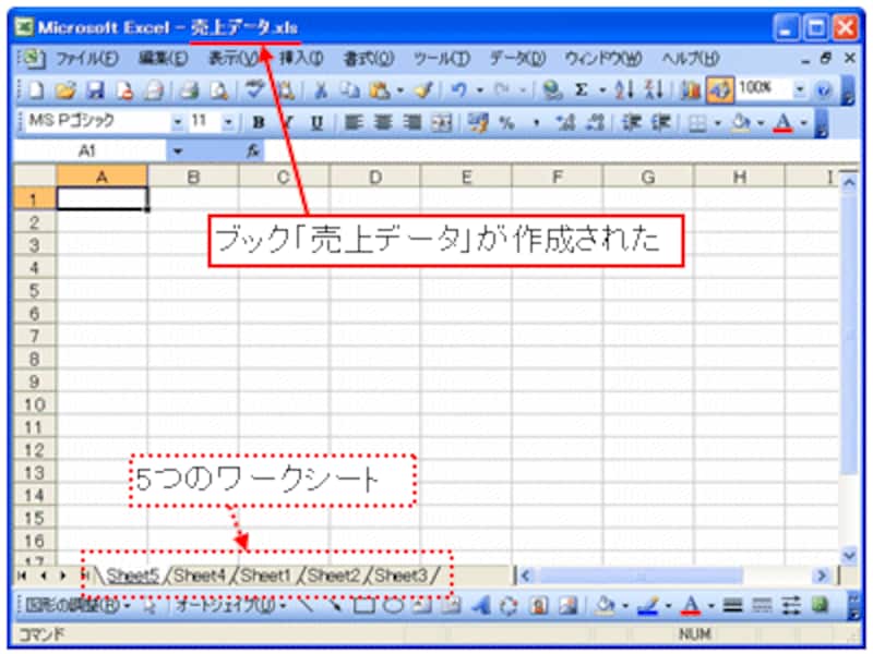 5つのワークシートをもつブック「売上データ」が作成されました。