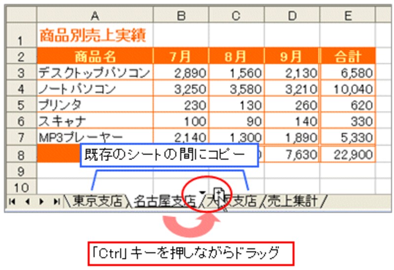 同じ形式の表、かつ既存の集計元シートの間であれば、集計元のシートを簡単に追加することができます。まず、既存の集計元のシート見出しを「Ctrl」キーを押しながらドラッグします。これで、ワークシートのコピーが作成されます。