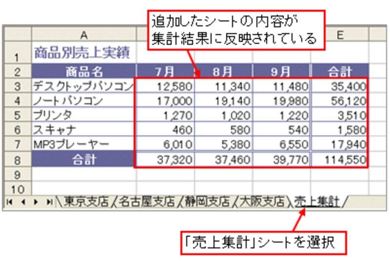 これで、シート追加は完了です。「売上集計」シートを見ると、追加したシートの内容が集計結果に反映されています。