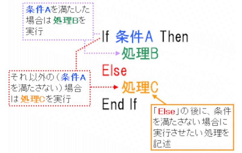 条件を満たさない場合に実行させたい処理を記述するには、「Else」を記述して、その後に処理を記述します。たとえば、「条件Aの場合は処理B、それ以外の場合は処理Cを実行する」といった処理を実行するIfステートメントは、次のように記述します。
